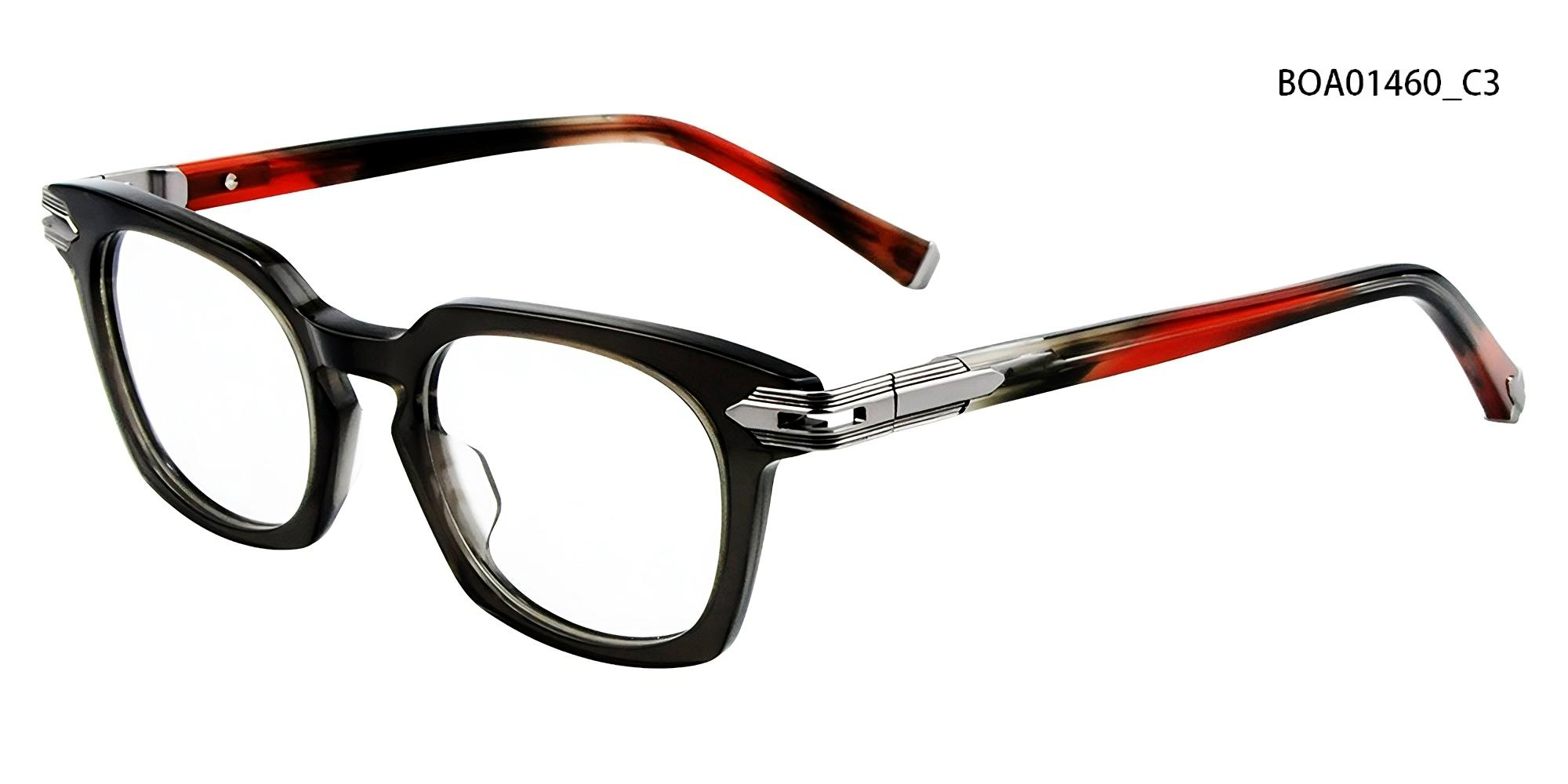 Esta montura cuadrada está fabricada con acetato de alta gama con una sutil transparencia, creando un efecto de capas. Los detalles metálicos en las bisagras le aportan un toque futurista, mientras que la silueta general mantiene un equilibrio entre robustez y elegancia.