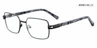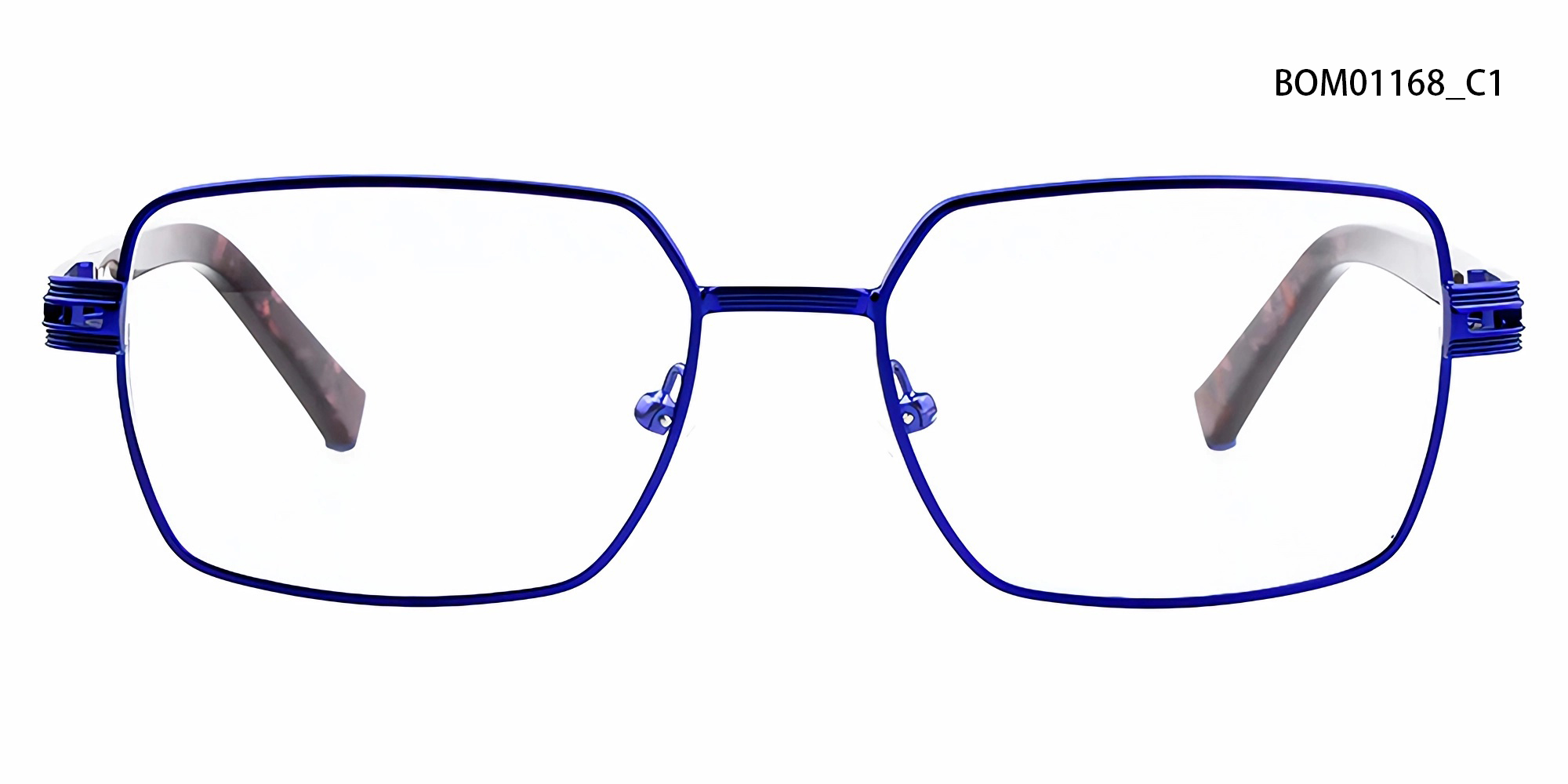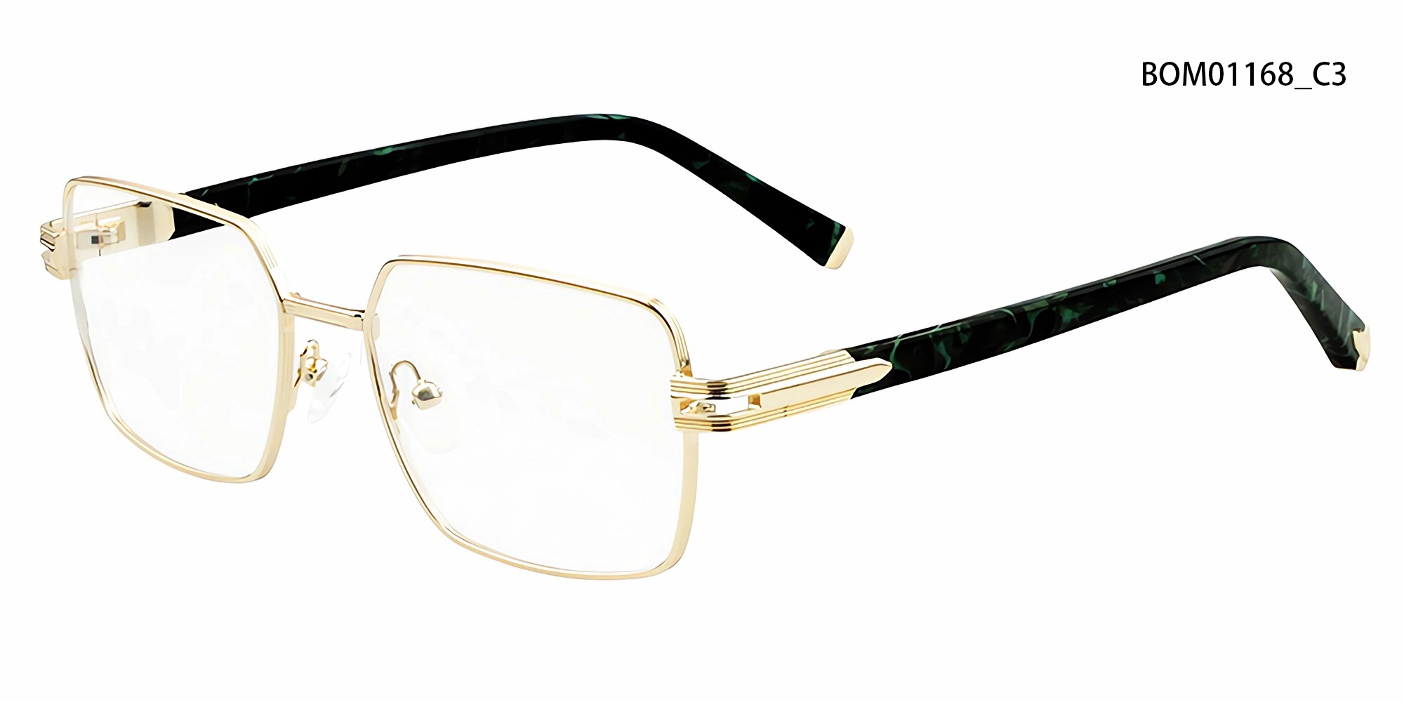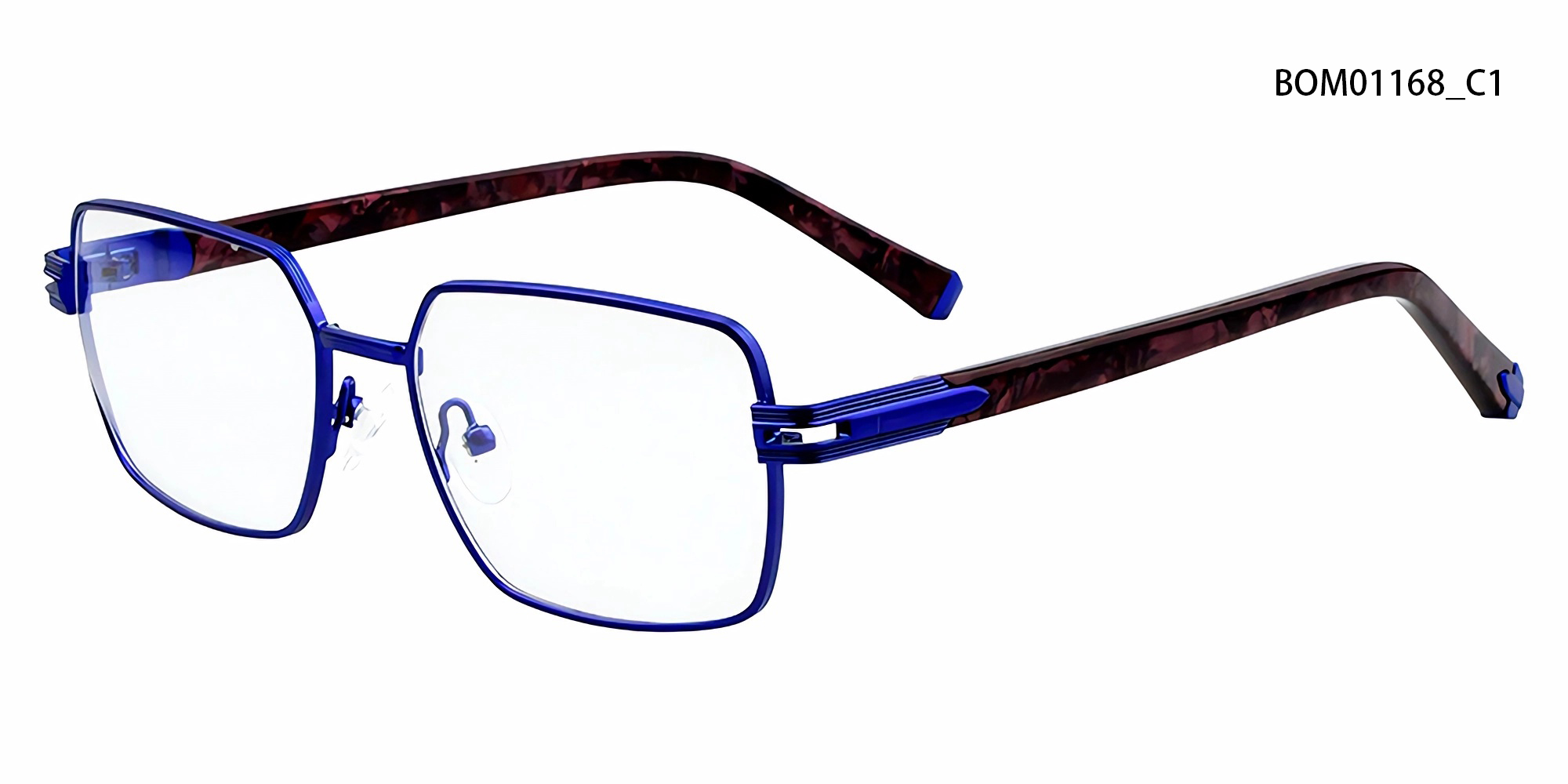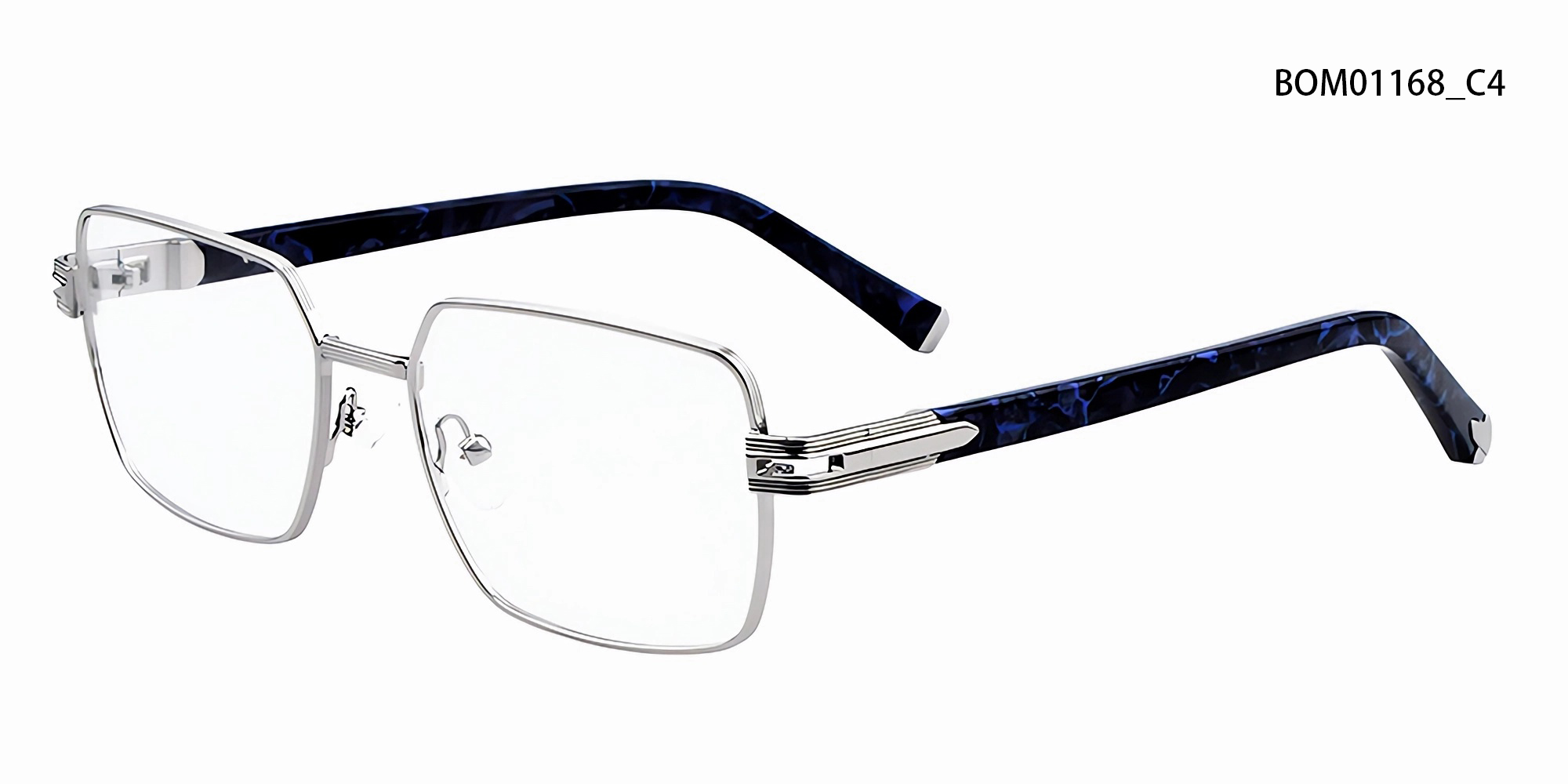 Esta montura óptica geométrica de metal destaca por su estructura minimalista y sus distintivas patillas de acetato con estampado de mármol. Su silueta definida se realza con finos detalles decorativos en las bisagras, que combinan la artesanía contemporánea con un toque artístico, perfectas para quienes aprecian un diseño refinado con personalidad.